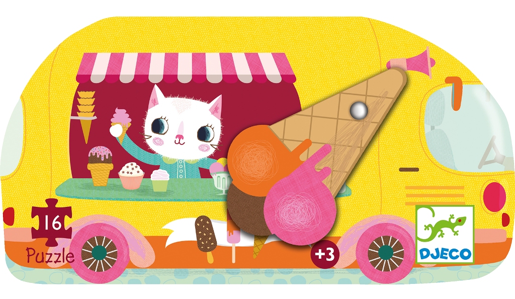 Ce puzzle coloré de 16 pièces est présenté dans une jolie boîte silhouette en forme de camion à glaces.