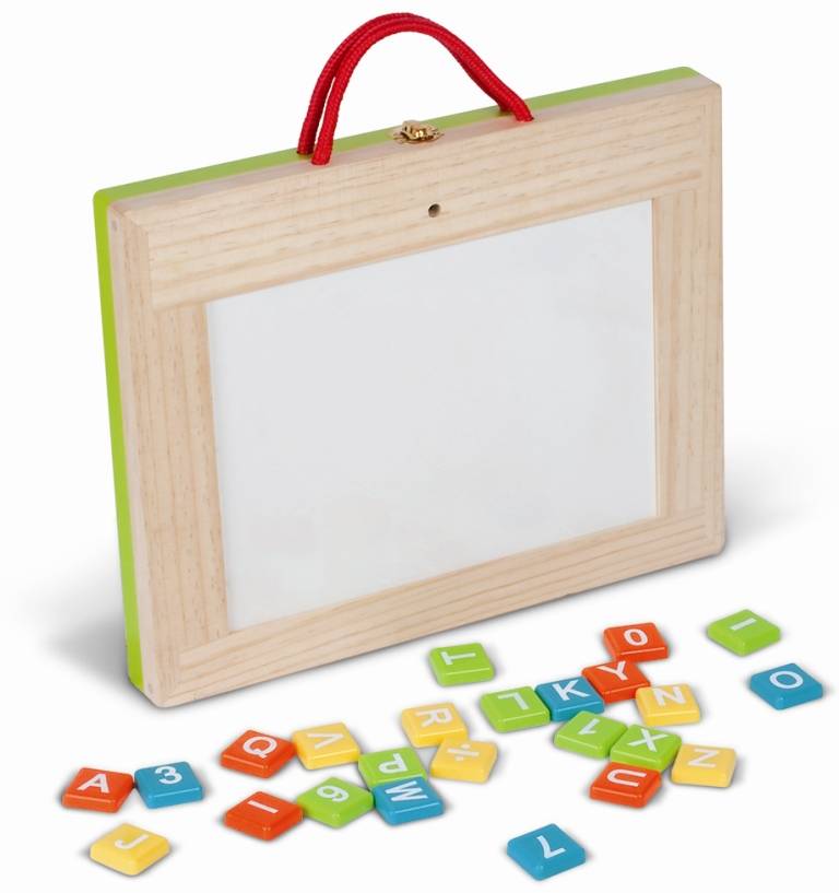 Ce Tableau Magic 4 en 1 contient 42 magnets (27 lettres, 10 chiffres et 5 signes), une boîte de craies, une brosse et un stylet.