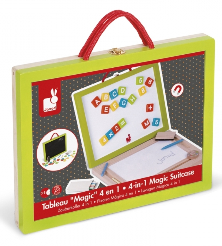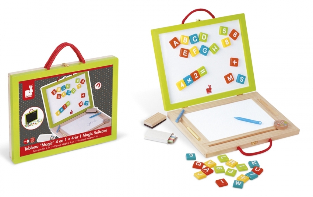 Cette mallette contient une ardoise magique avec son stylet pour écrire ou dessiner en effaçant facilement, une face magnétique avec des magnets lettres, des chiffres et des signes, une ardoise noire avec des craies et une brosse et une ardoise blanche pour écrire avec un feutre effaçable (non fourni).