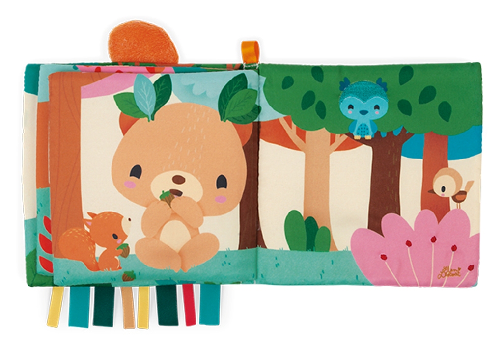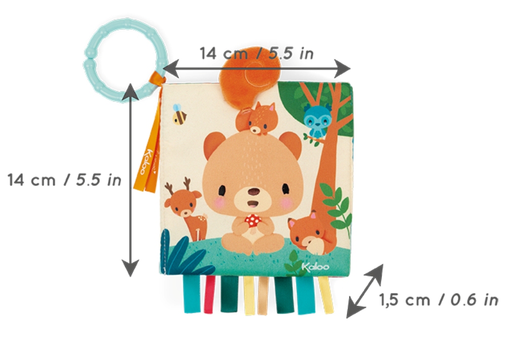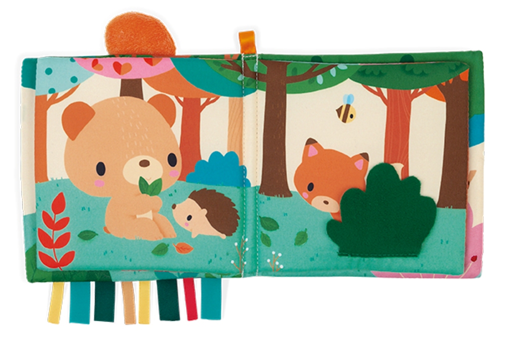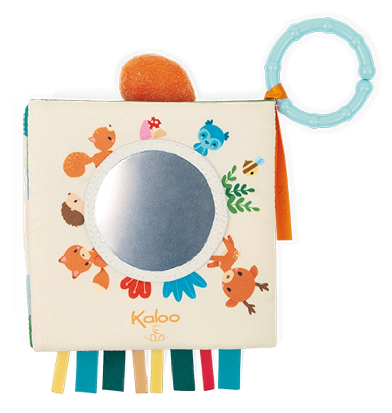 Il inclut plusieurs activités d’éveil : papier bruissant, pouêt, miroir, flaps et rubans à tripoter.
