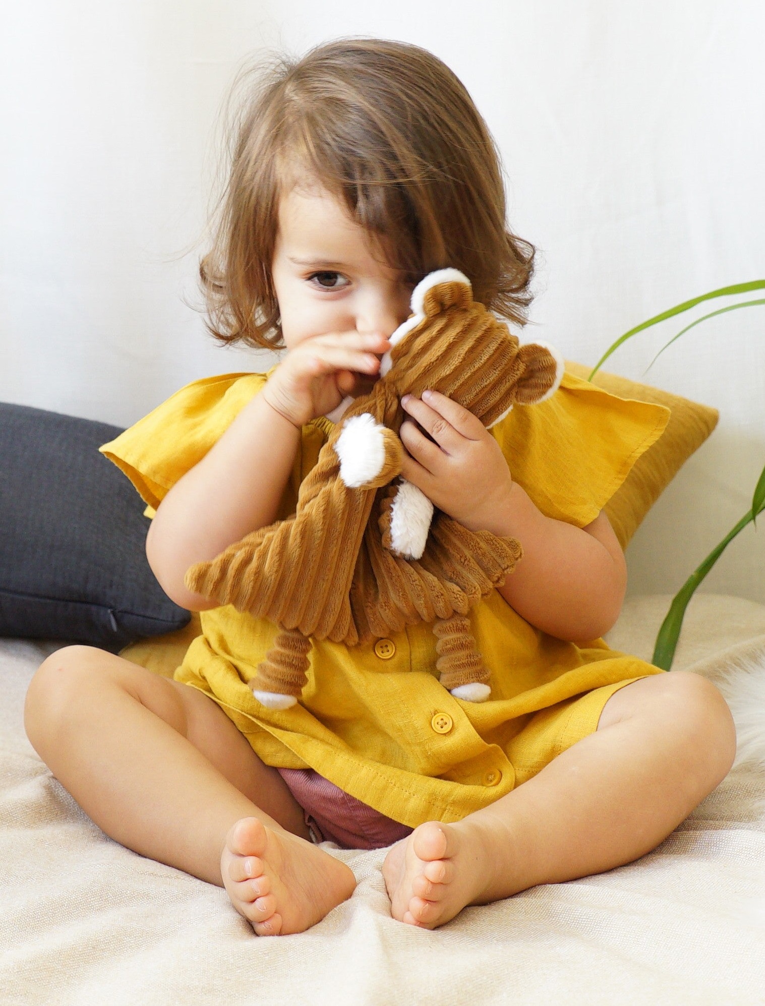 Conçu dans des matières douces et moelleuses, ce doudou est parfait pour les moments de câlins, de réconfort et d’endormissement.