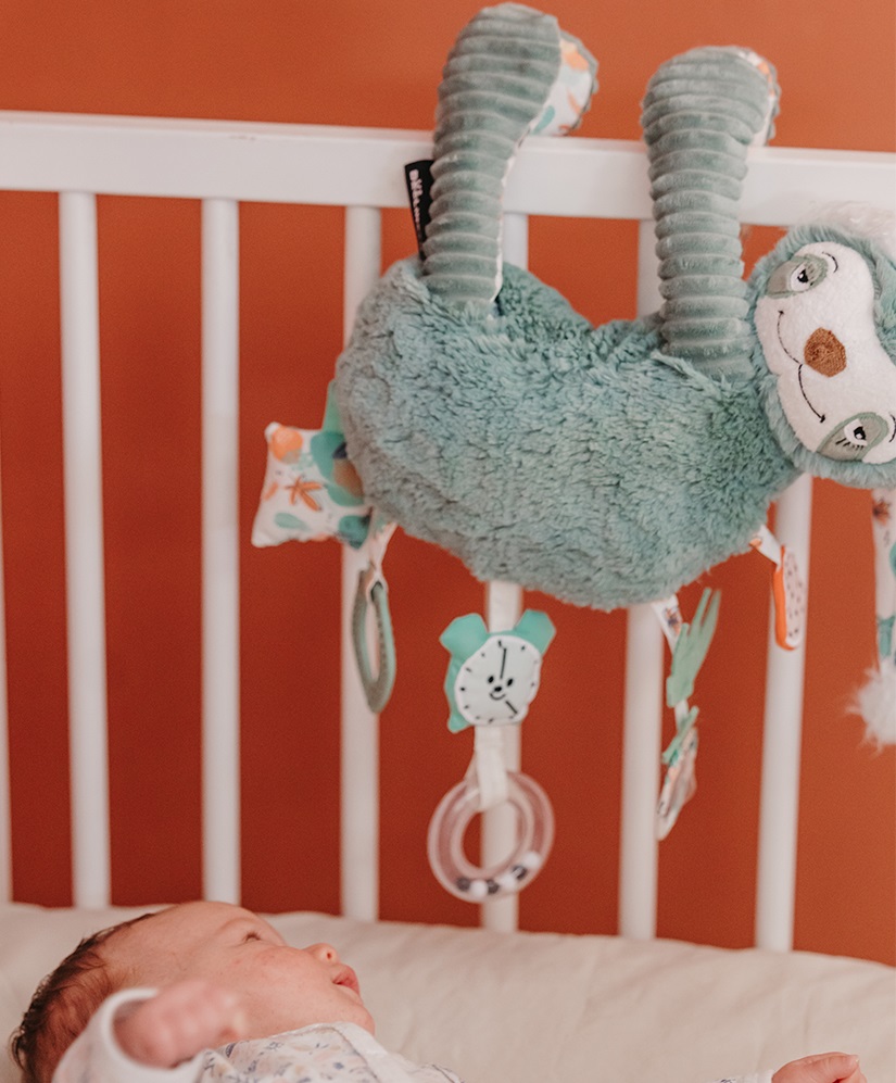 Pratique, la peluche d’activités peut s’accrocher à un lit, une poussette, un transat ou une arche d’activités, permettant d’accompagner bébé aussi bien à la maison qu’en déplacement.