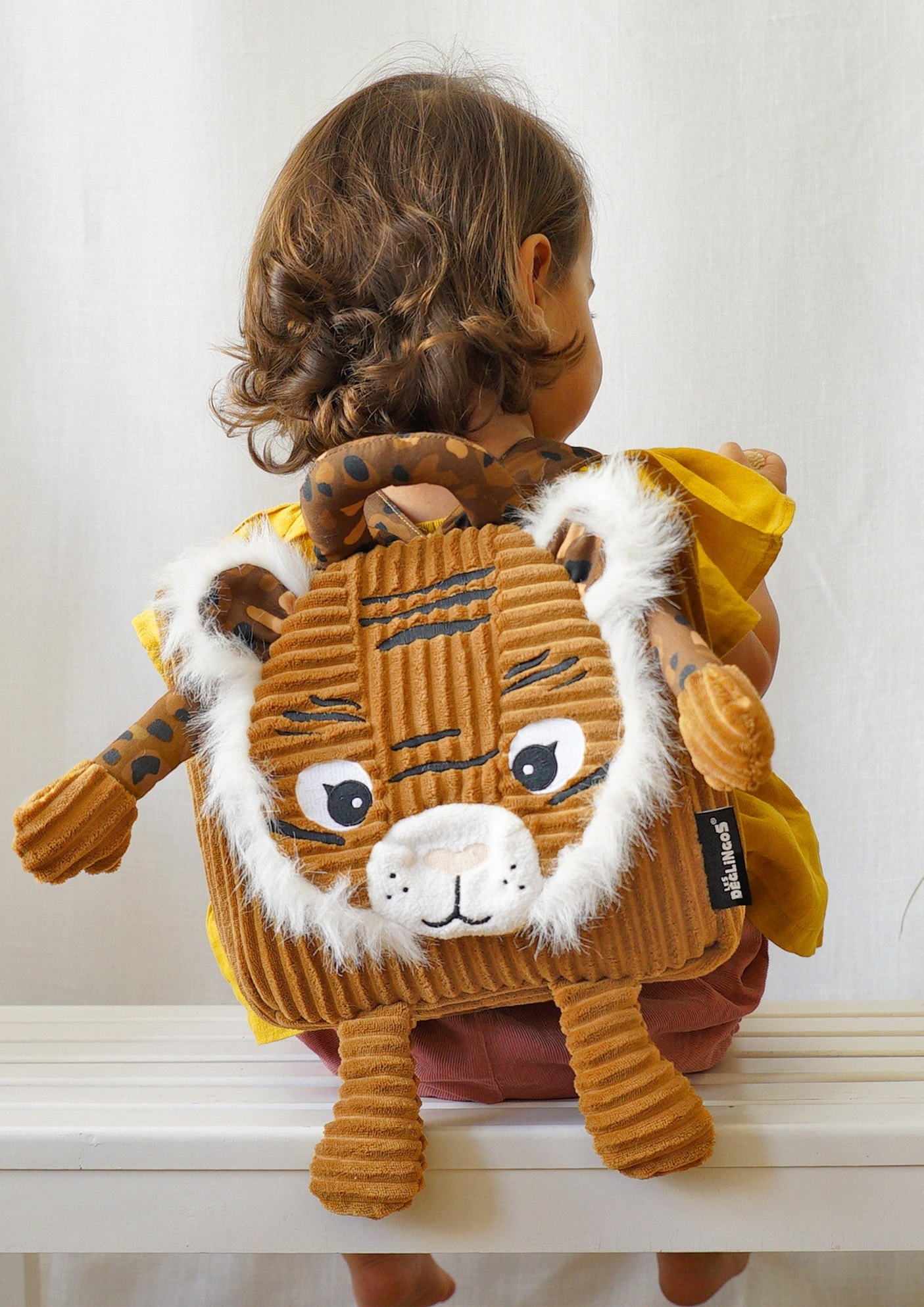 Le sac à dos enfant Les Déglingos Spéculos le tigre en velours côtelé est l’accessoire idéal pour allier douceur, fonctionnalité et style décalé.