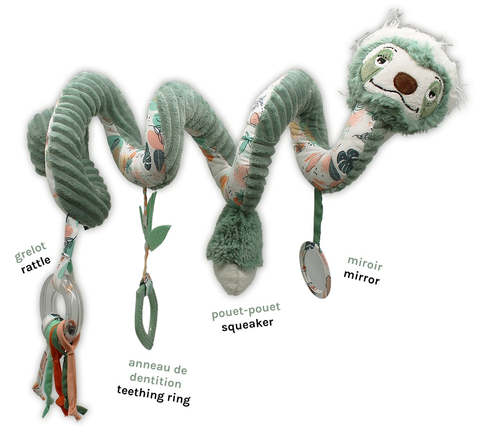 La spirale d’activité Chillos le Paresseux Les Déglingos est le compagnon idéal pour stimuler l’éveil de bébé dès ses premiers mois.