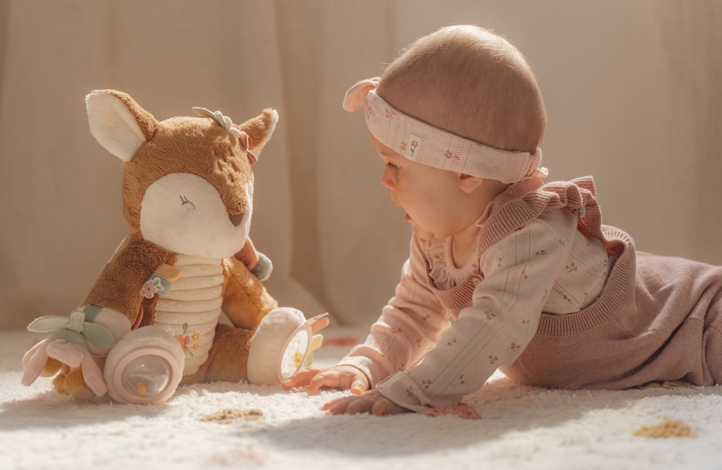 Posez le faon devant bébé pour l'encourager à lever la tête et à utiliser ses mains, favorisant ainsi le renforcement des muscles de son cou et de son dos.
