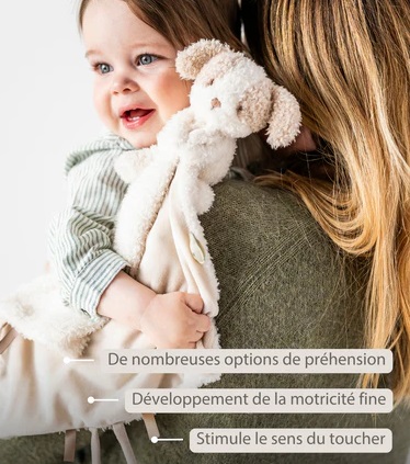 Ses petites oreilles, ses pattes souples et son tissu léger sont faciles à attraper, favorisant la motricité et l’éveil sensoriel de bébé.