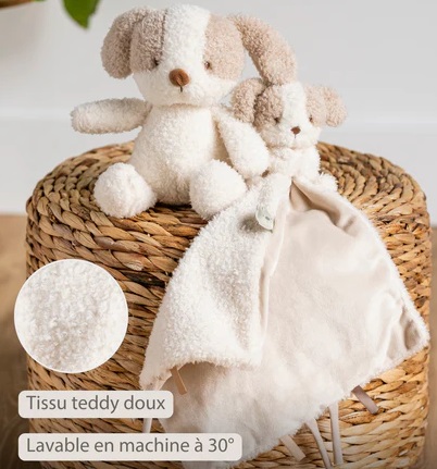 Pratique et facile à entretenir, le doudou mouchoir chien Teddy Nattou se lave en machine sans perdre sa douceur, pour rester propre et prêt à être câliné à tout moment.