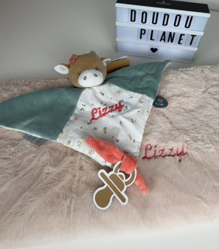 Ce doudou plat douillet dispose de liens en tissu permettant d’y fixer la tétine afin qu’elle ne se perde pas en chemin.