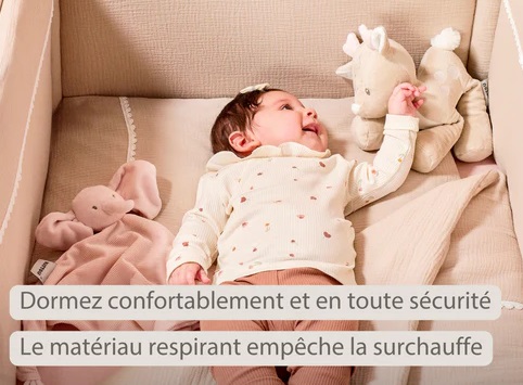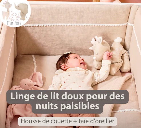 L’ensemble housse de couette et taie d’oreiller mousseline Fanfan Nattou associe élégance, douceur et légèreté, créant un véritable cocon de bien-être pour le sommeil de bébé.