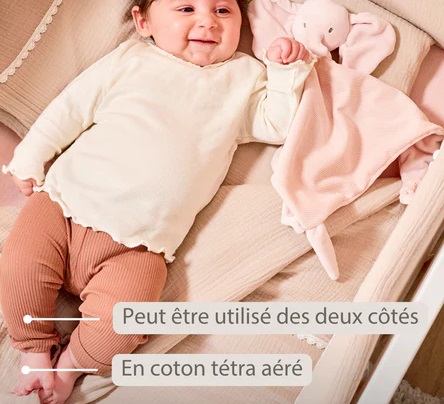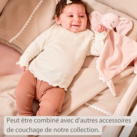 Sans motif, cet ensemble s’adapte à tous les styles de décoration tout en gardant l’esprit tendre et raffiné propre à la collection Fanfan Nattou.