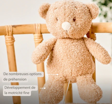 Grâce à son design tendre et rassurant, l’ours Teddy devient vite le compagnon préféré de bébé, aussi bien pour le coucher que pour les moments de câlins.