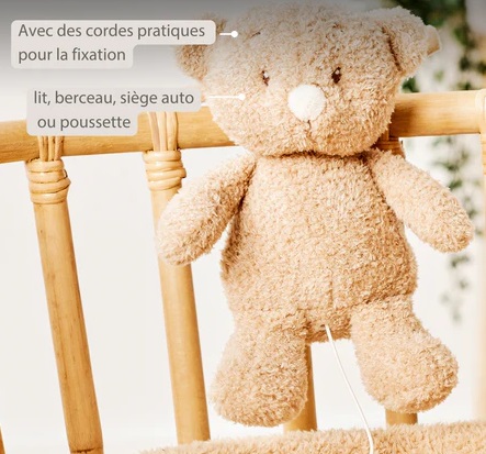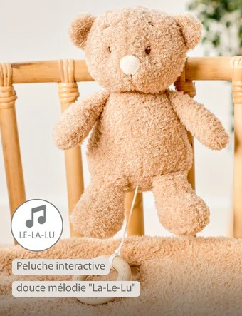 À l’effigie de la collection Teddy, cet adorable ours tout moelleux diffuse une douce mélodie apaisante pour aider bébé à s’endormir calmement.