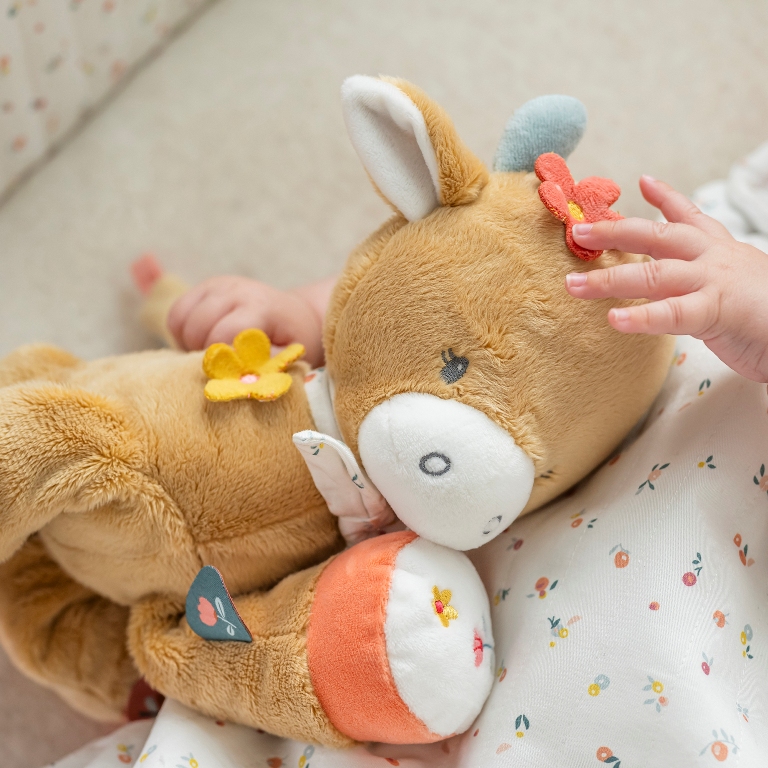 Cette peluche offre de nombreuses possibilités de saisie et favorise le développement de la motricité globale et fine.