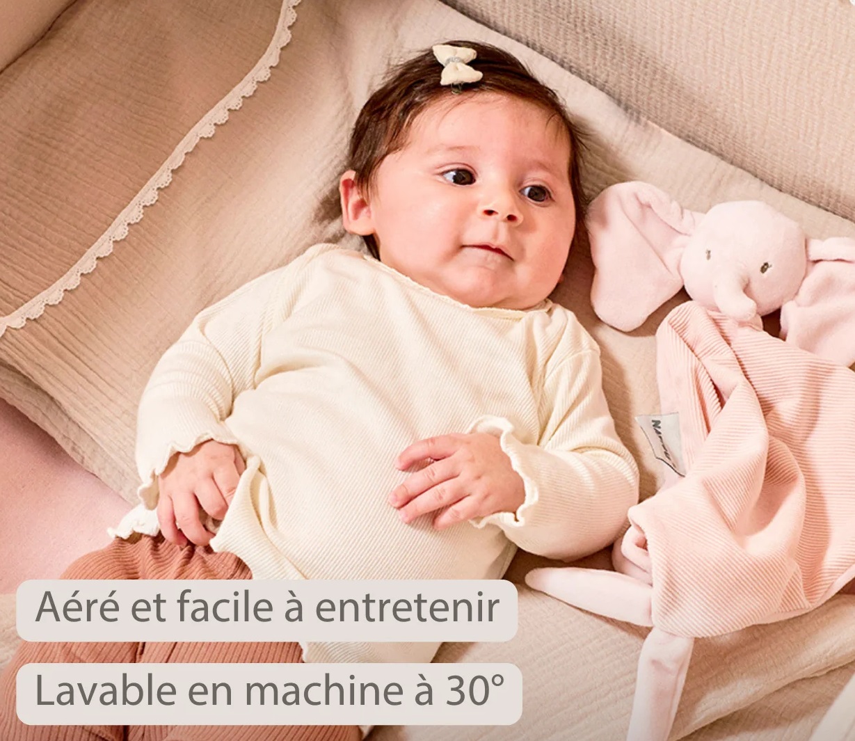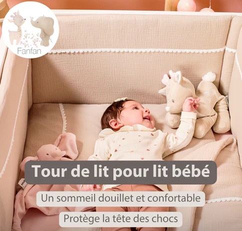 Le tour de lit mousseline Fanfan Nattou allie douceur, sécurité et esthétisme pour créer un environnement de sommeil paisible et réconfortant pour bébé.