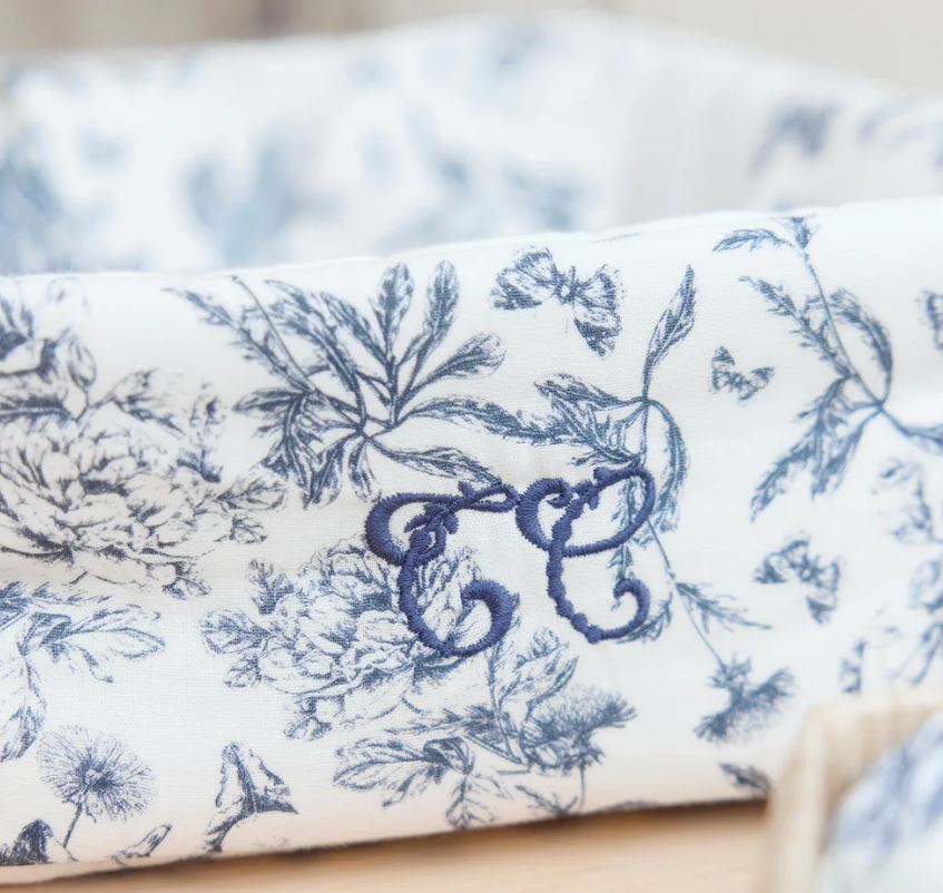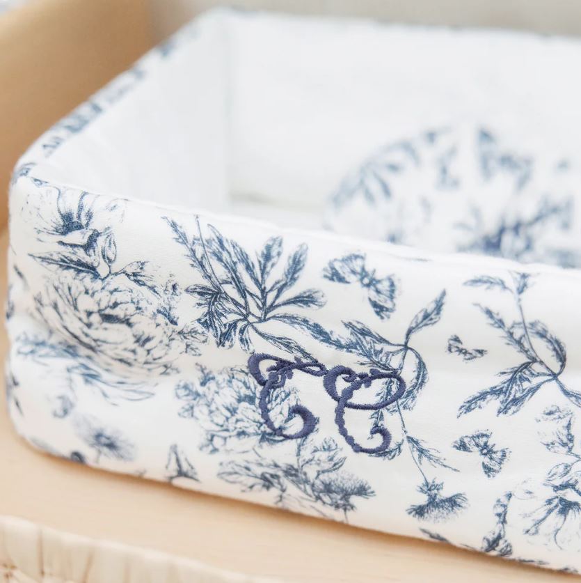Découvrez les accessoires raffinés de la collection Toile de Jouy Tartine et Chocolat, où tradition française et élégance intemporelle s’unissent pour sublimer le quotidien de bébé.Le panier de rangement Toile de Jouy marine Tartine et Chocolat est l’accessoire idéal pour garder la chambre de bébé parfaitement organisée tout en ajoutant une touche d’élégance intemporelle.